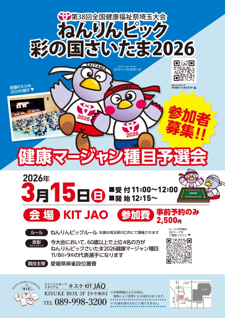 本戦大会は、2026/11/8(日)~11/9(月)に埼玉県川口市『健康マージャンの文化交流大会』が開催されます。