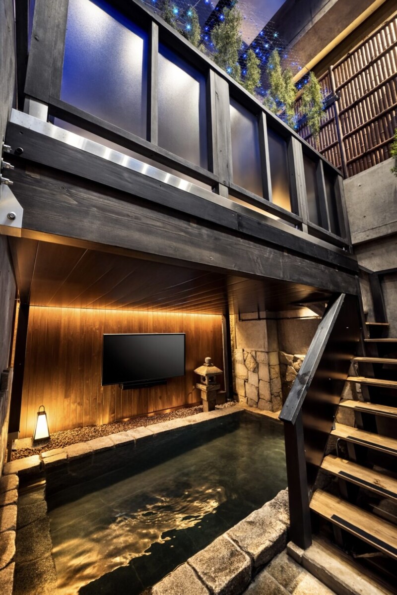 フィンランドのスモークサウナと和の美意識を融合させた、当館オリジナルのスタジアムサウナです。室内の漆黒は、スモークサウナ特有の深みを表現するため「奈良墨」と「渋墨」を独自に調合し、上質な黒に仕上げました。