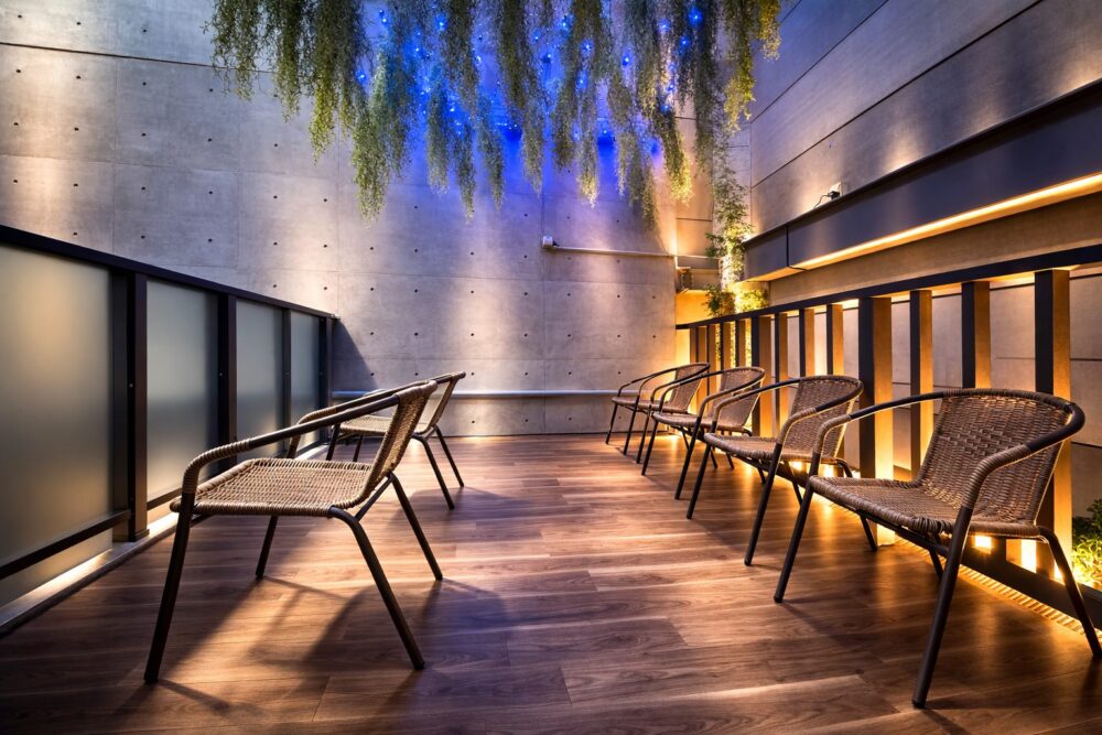 露天ならではの開放感の中で、自然光と外気をダイレクトに感じられる設計です。サウナ後の高まった心拍をゆっくり落ち着かせ、質の高いクールダウンへ導きます。