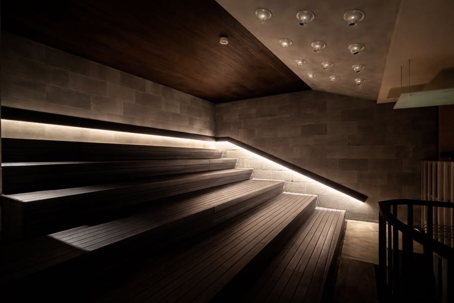 適度な暗さと、ととのいへ誘う静かなBGM。打ち抜きコンクリートのひんやりとした質感が心地よい、ととのい空間へ。