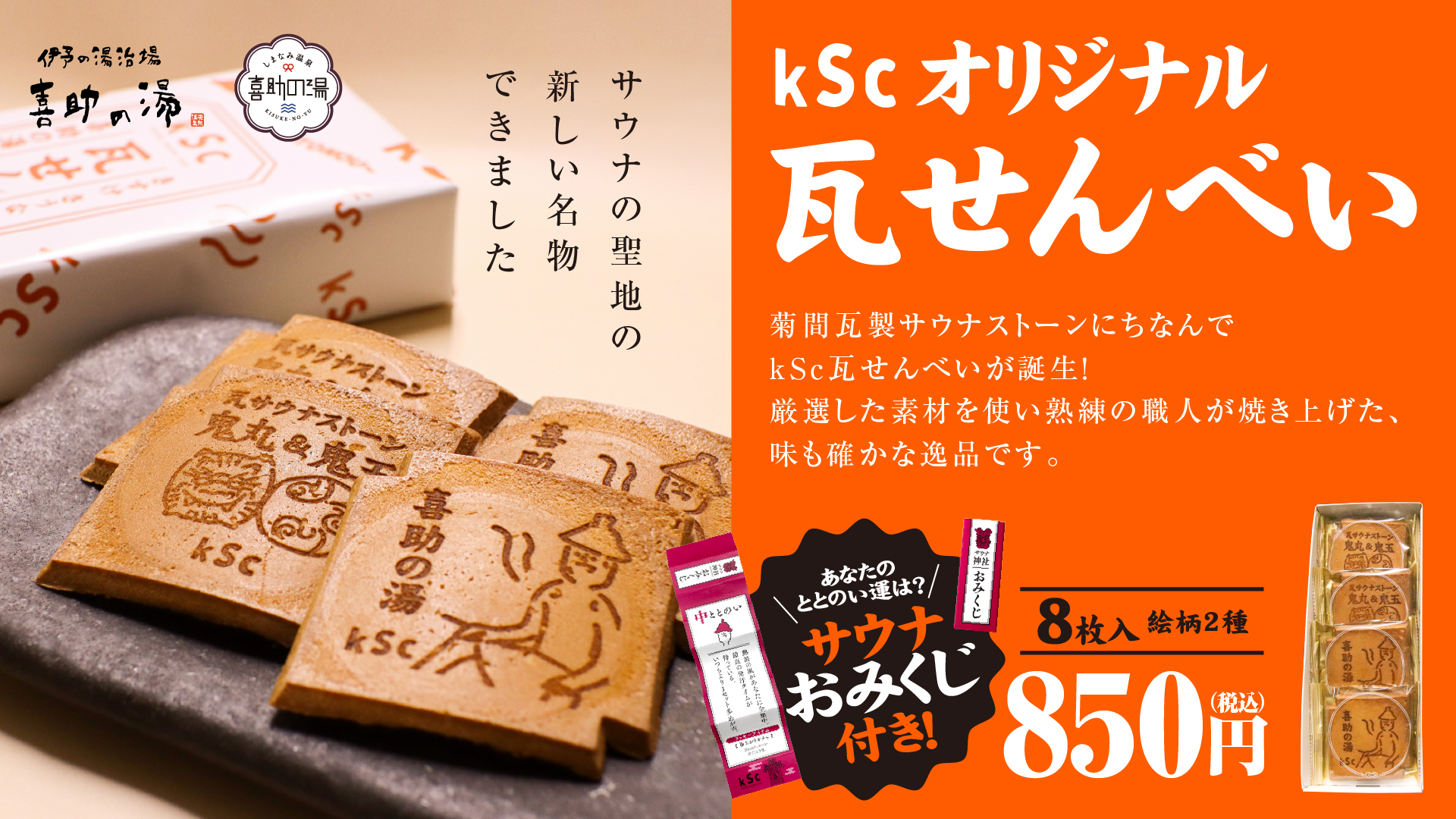 「kSc瓦せんべい」は、2023年に神戸の老舗「亀井堂総本店」とコラボレーションして誕生した、喜助の湯オリジナルの人気土産です。菊間瓦製サウナストーン「鬼丸・鬼玉」をモチーフにした商品として、多くのお客様にご好評をいただいてきました。