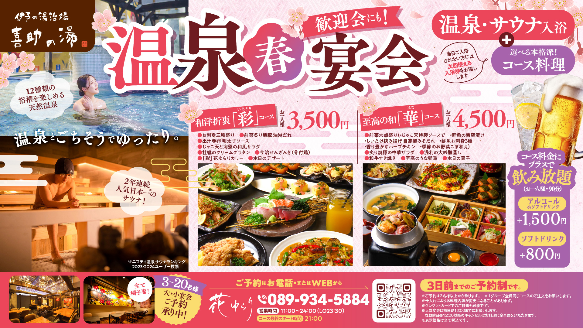 伊予の湯治場 喜助の湯では、春の歓送迎会やお集まりにぴったりの宴会プランをご用意しております。