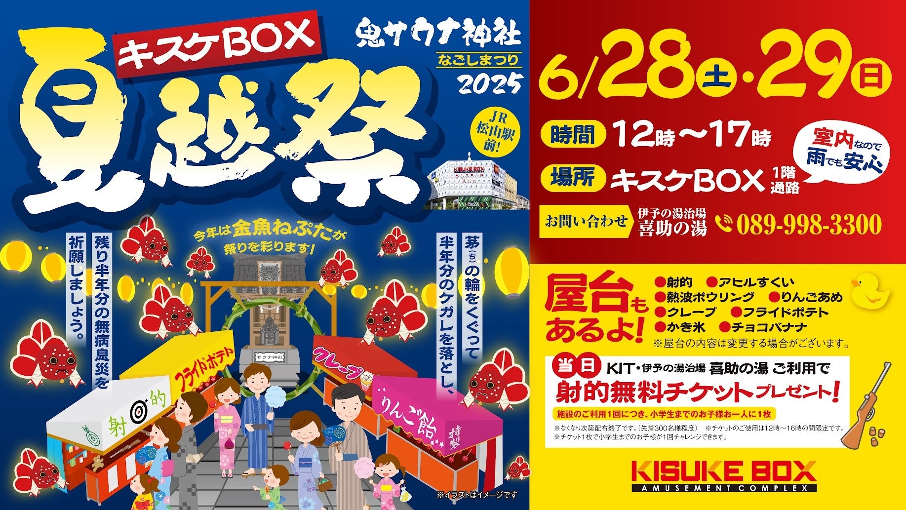キスケ株式会社は「鬼サウナ神社」が、2025年6月28日(土)・29日(日)に建立2周年を記念した年に一度の特別祭事「夏越し祭2025」を開催します! サウナと神道が奇跡的に融合したこの祭りは、日本の伝統的な「茅の輪くぐり」を通じて心身を清め、厄を祓った後に、家族みんなで楽しめる屋台やアクティビティを満喫できる、まさに「ととのい」の夏フェスです。