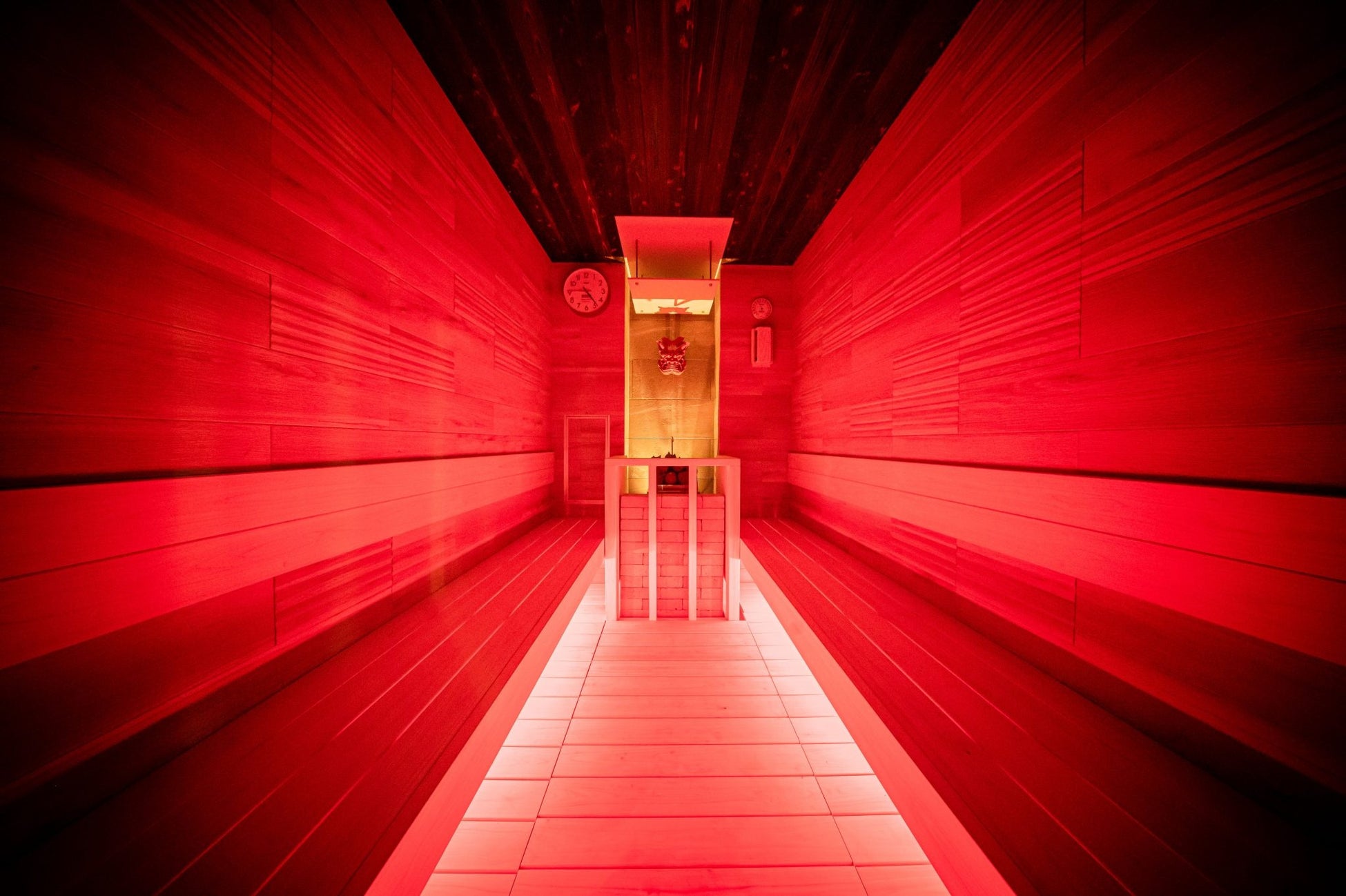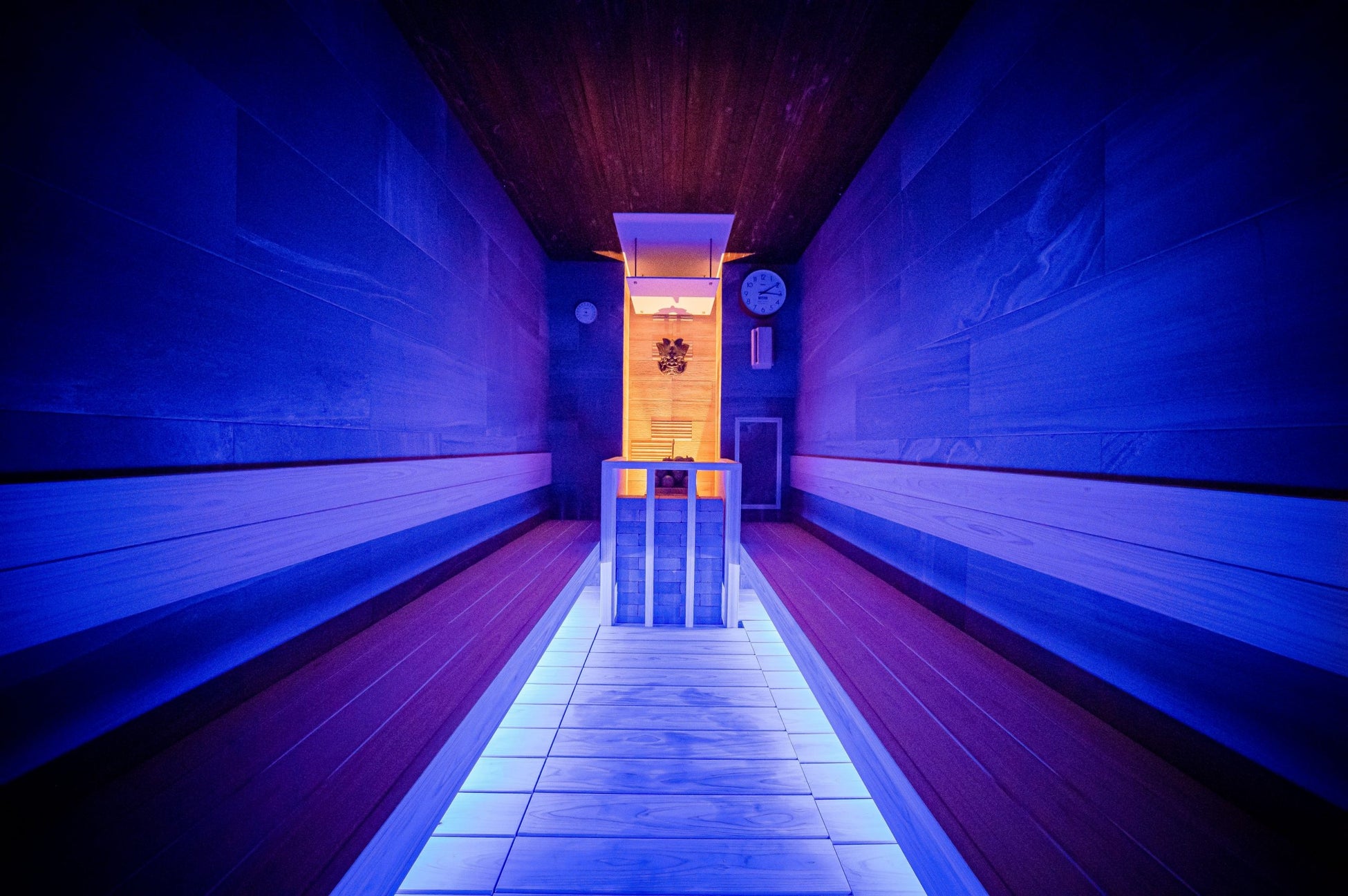 蒼は落ち着いた青照明と自動ロウリュ、炎は赤い空間とセルフロウリュによる120℃超の体感熱で、心身を極限までととのえます。