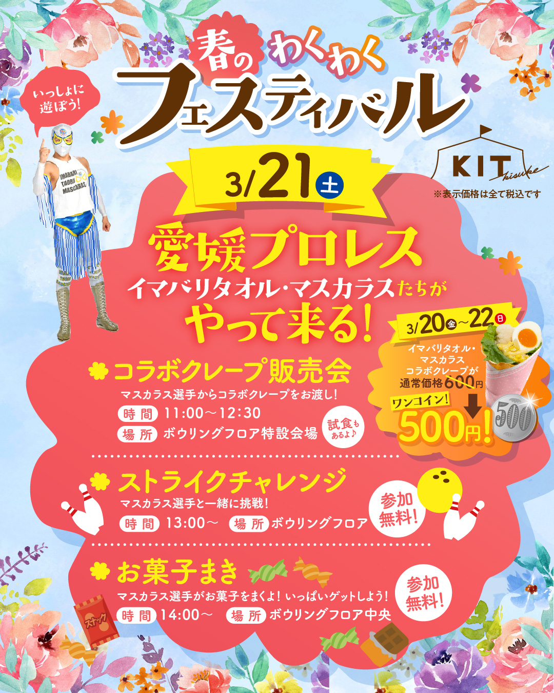 3/20(金)~22(日)の3連休には、愛媛プロレス(イマバリタオルマスカラス選手 他)もやってくる!