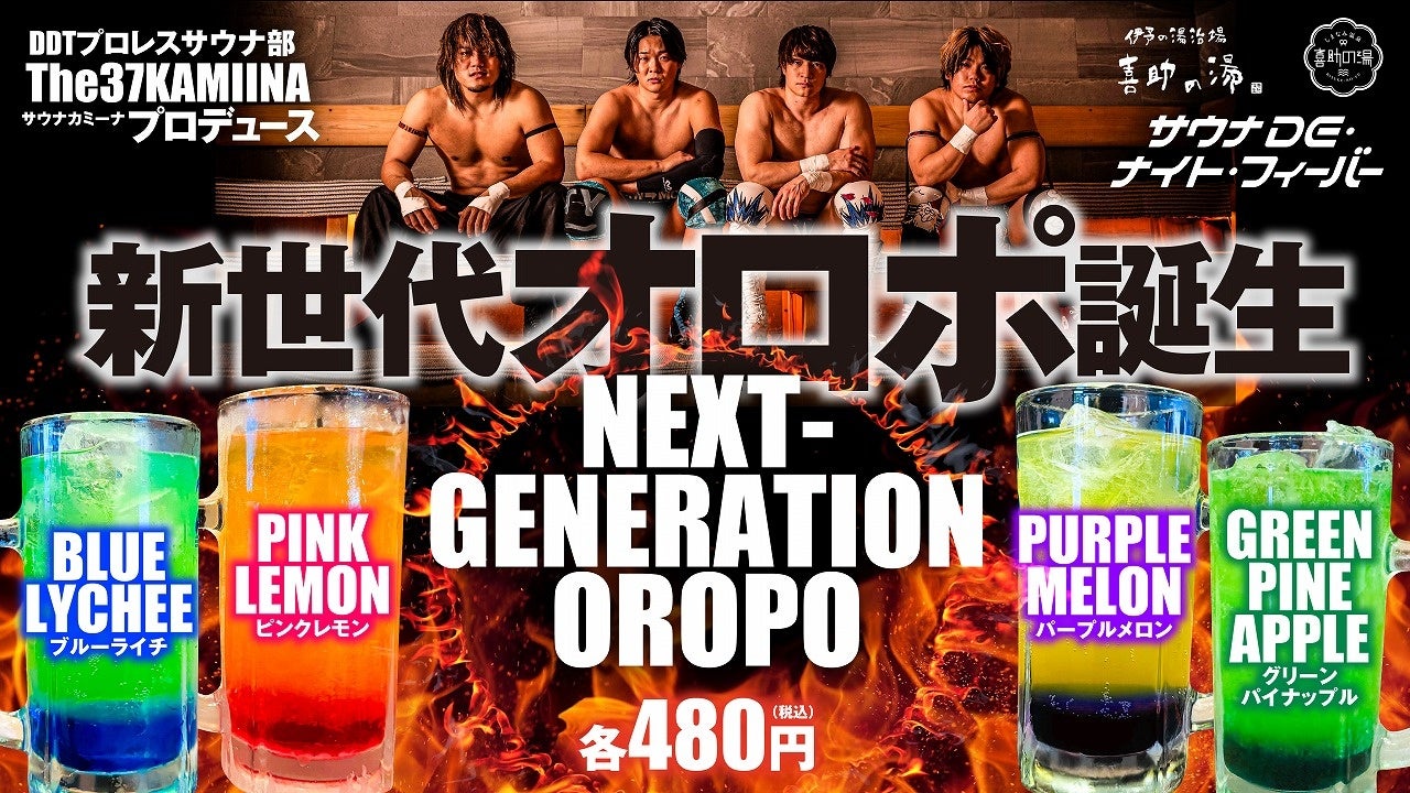 イベントに合わせて、DTTプロレスサウナ部『The37KAMIINA』が新たにプロデュースした「次世代オロポ」4種類が販売されます。サウナ愛好者のニーズを反映し、斬新なフレーバーと鮮やかなカラーでサウナ後の活力をチャージするこの新商品は、次世代のリフレッシュエナジードリンクとして期待されています。