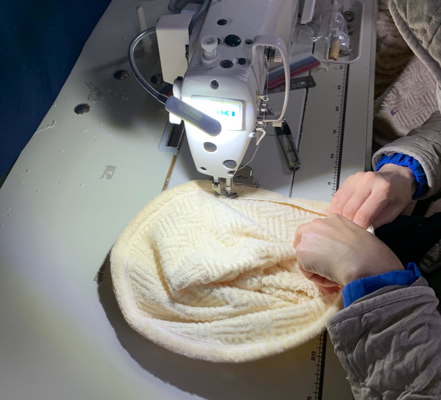 このサウナハットは、歩き遍路では欠かせないアイテムである菅笠(すげがさ)をモチーフにしてデザインされています。菅笠は、スゲというイネ科植物を編み込んで作られた笠であり、その風合いを忠実に再現するために、今治のタオル工場に生地からデザイン・製造を依頼しました。タオル生地にはロングパイルを使用し、柔らかく肌触りの良いパイル地はサウナ室内でも快適にご使用いただけ、吸湿性にも優れています。