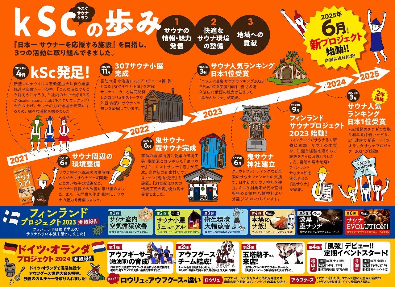 喜助の湯は、サウナ愛好家を支援する施設として「kSc - Kisuke Sauna Club」を立ち上げ、サウナ文化の発信、快適な環境整備、地域への貢献を3本柱に事業を展開してきました。