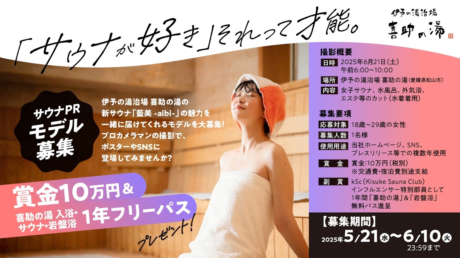 愛媛県松山市の温浴施設「伊予の湯治場 喜助の湯」を運営するキスケ株式会社(本社:愛媛県松山市)は、2025年6月21日(土)にリニューアルオープンする女性専用サウナ「藍美サウナ -aibi-」の魅力を全国に発信するため、PRモデル&インフルエンサーを一般公募いたします。