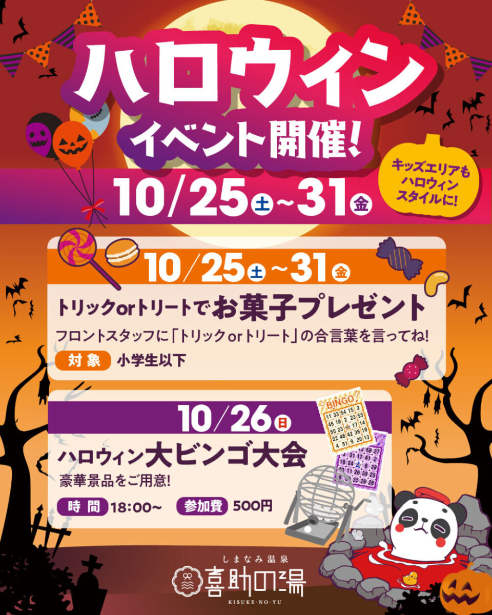 今年も喜助の湯では、ハロウィンにぴったりの楽しいイベントをご用意しました!館内やキッズエリアもハロウィン仕様に変身✨ ご家族やお友達と一緒に、特別な時間をお楽しみください。