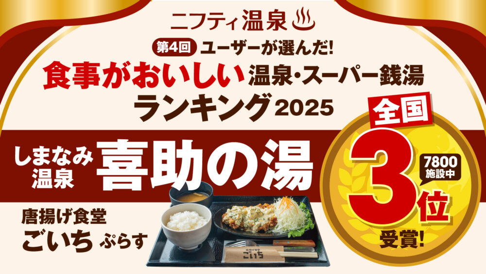 しまなみ温泉 喜助の湯」に併設するレストラン、「からあげ食堂 ごいち+(ぷらす)」が、2025年10月23日(木)、日本最大級の温浴情報サイト「ニフティ温泉」が発表した『第4回 ユーザーが選んだ!食事がおいしい温泉・スーパー銭湯ランキング2025』において、全国第3位にランクインしました。