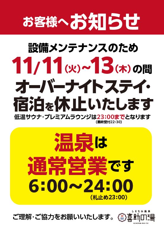 オーバーナイトステイ・宿泊休止のご案内(11/11〜13)