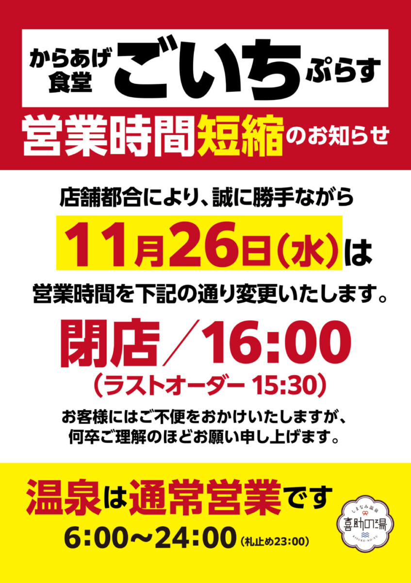誠に勝手ながら、店舗都合により下記日程の営業時間を短縮させていただきます。