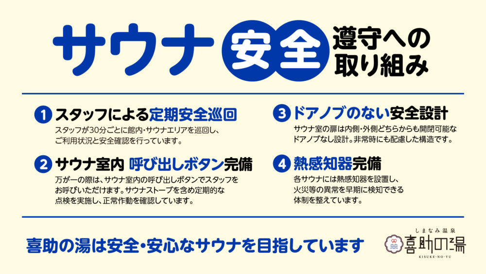 喜助の湯では、お客様に安心してサウナ・岩盤浴をご利用いただくため、以下の安全対策を実施しています。