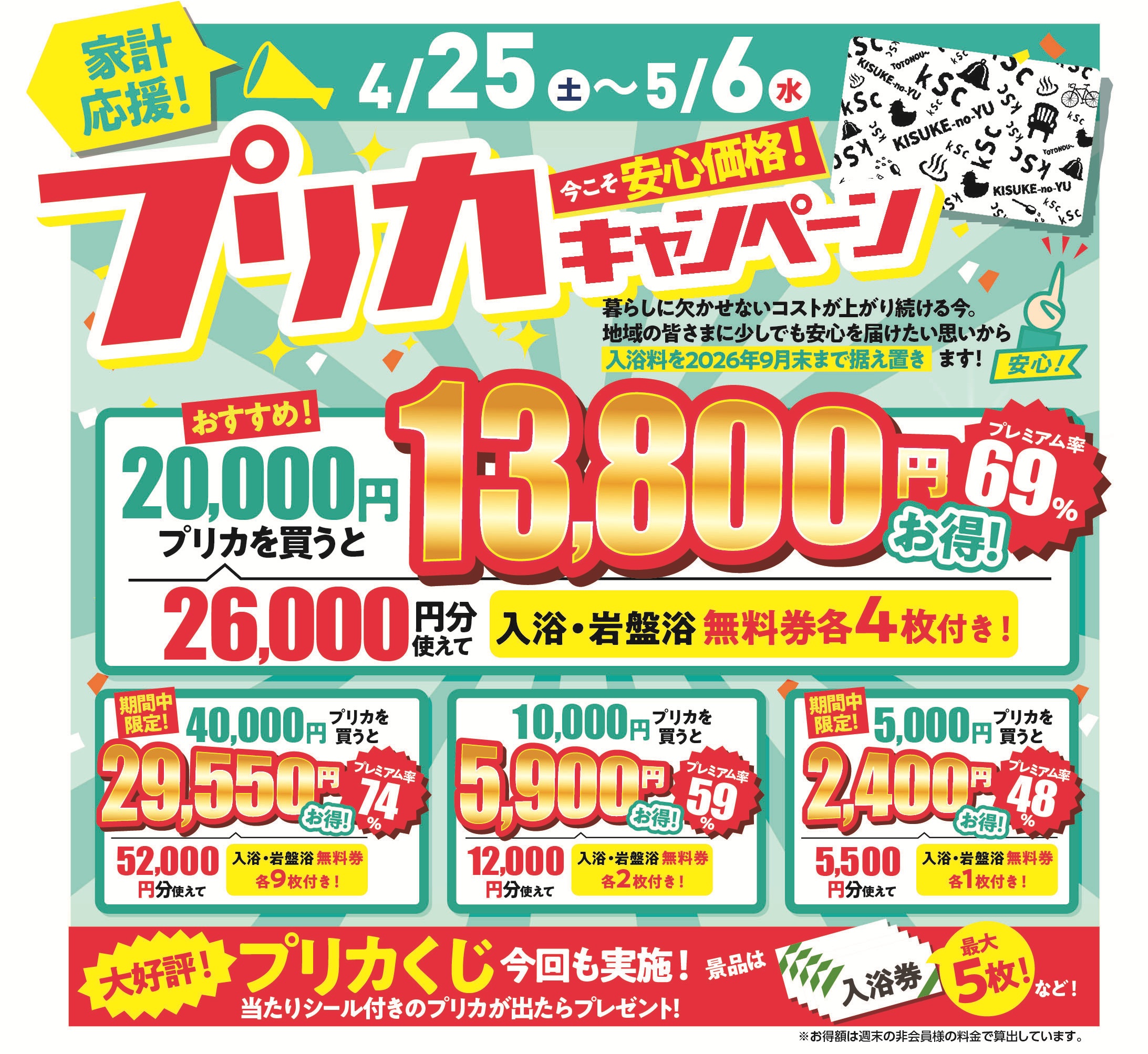 喜助の湯では、2026年4月25日(土)から5月6日(水)までの期間限定で、「家計応援!今こそ安心価格 お得なプリカキャンペーン」を開催いたします。