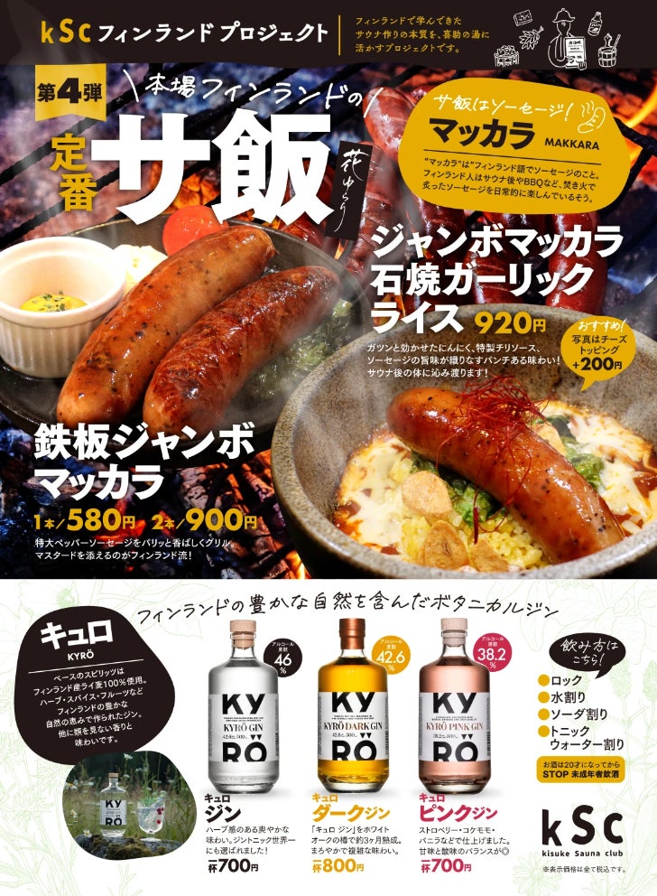 リニューアルした花ゆらりでは、愛媛の郷土料理と共に、サウナ後の一息を楽しむ「サ飯」にも力を入れています。kScアンバサダーである愛媛プロレスの石鎚山太郎さんがプロデュースした期間限定サ飯として「極太ナポリタン」や、本場フィンランドのサ飯である「マッカラ」を使ったメニューなどが提供されています。以下は、現在提供しているメニューの一例です。
