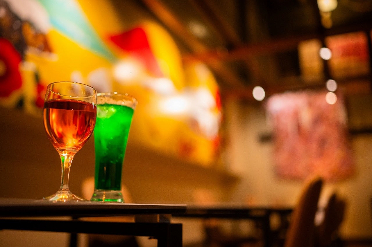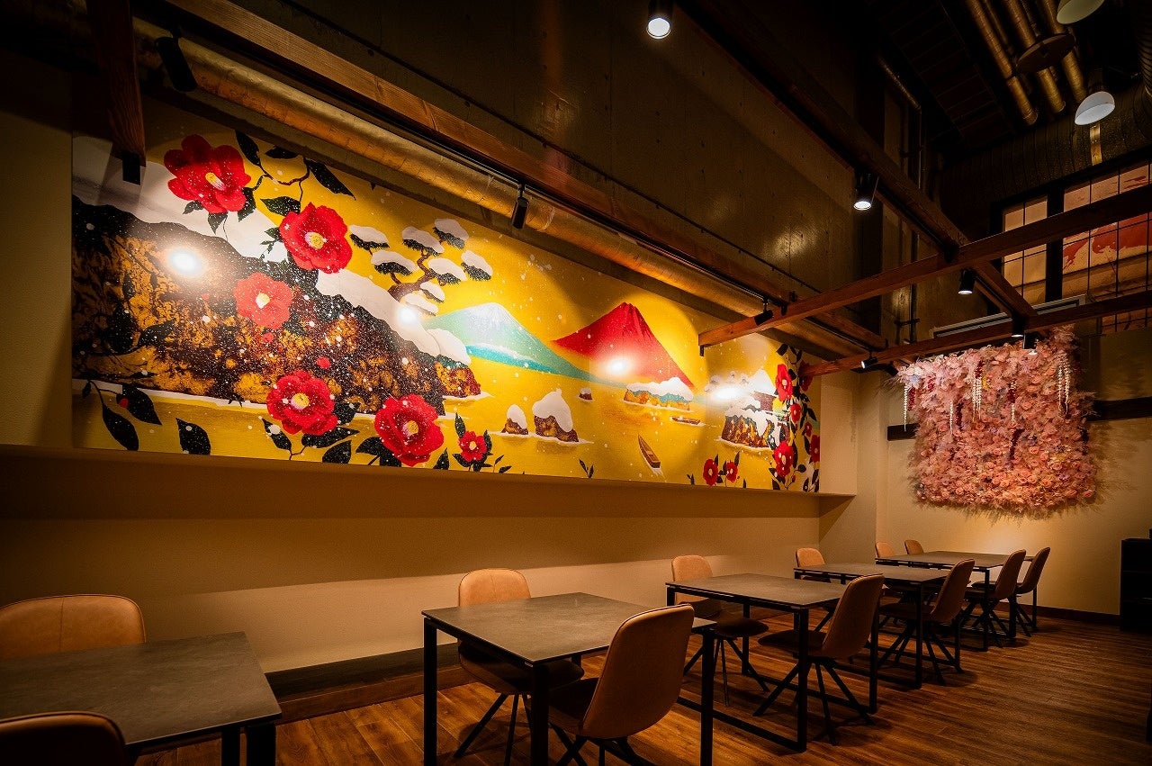 リニューアルにより、和室はバリアフリー対応となり、高齢のお客様から要望の多かった椅子席へと変更されました。また、内装に使った壁画は、現在「喜助の湯」の女性風呂と同じく、松山市の市花である【椿】をモチーフにした作品が展示されています。この壁画は、世界で活躍している画家【田中ラオウ】さんが2020年に描いたもので、店内に一層の華やかさを加えています。