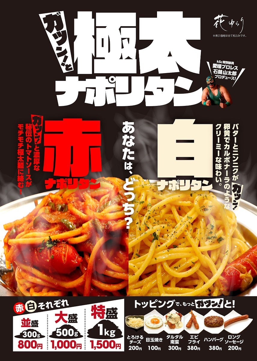 kScアンバサーダー愛媛プロレスの石鎚山太郎さんがプロデュースしたガツンとくる「極太ナポリタン」。モチモチ極太麺に、濃厚トマトソースの「赤」と、バターとニンニクの効いたクリーミーな「白」。豊富なトッピングで、自分好みの味わいを楽しんで!