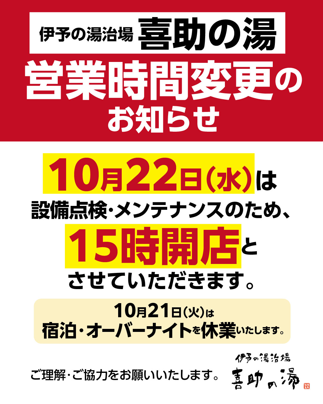 10月22日(水)は設備点検・メンテナンスのため15時開店とさせていただきます。