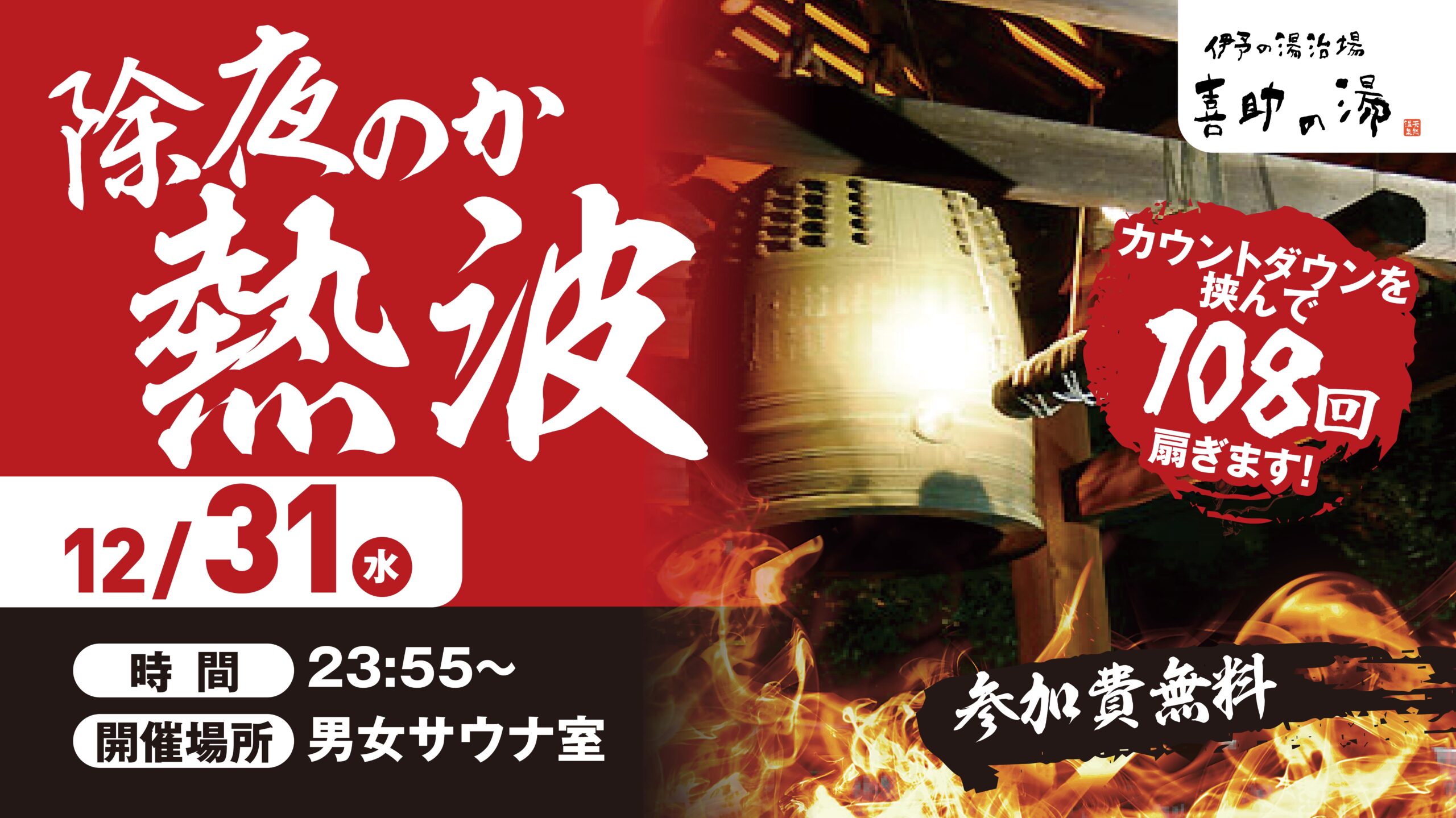 12月31日(火)23:55より、喜助の湯では年越し恒例イベント 「除夜のか熱波」 を開催します!