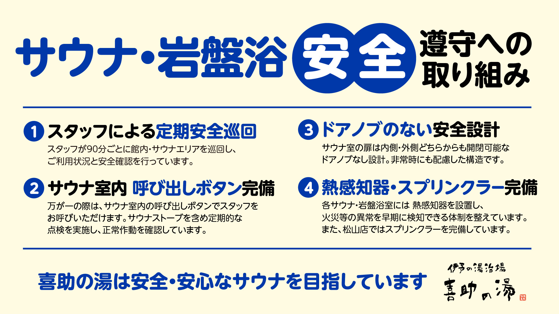 これからも喜助の湯は、安全・安心なサウナの環境づくりに努めてまいります。