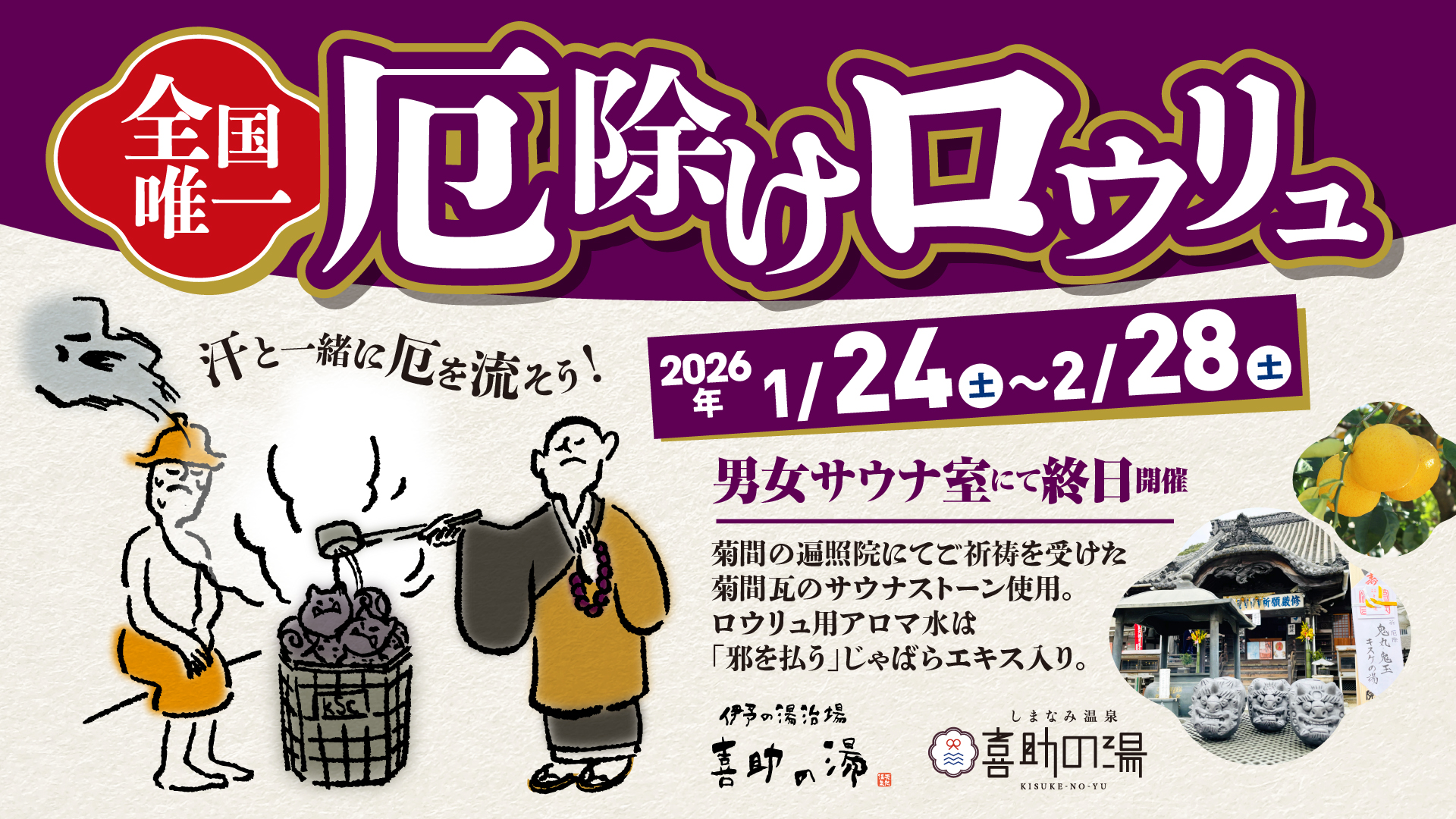 「喜助の湯」では、2026年1月24日(土)~2月28日(土)まで、日本初の“サウナで厄除け”ができる「厄除けロウリュ」を今年も開催します。
