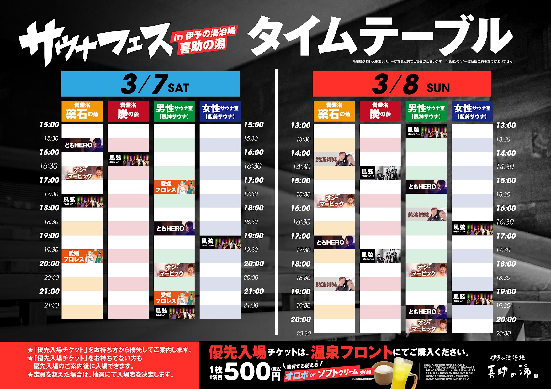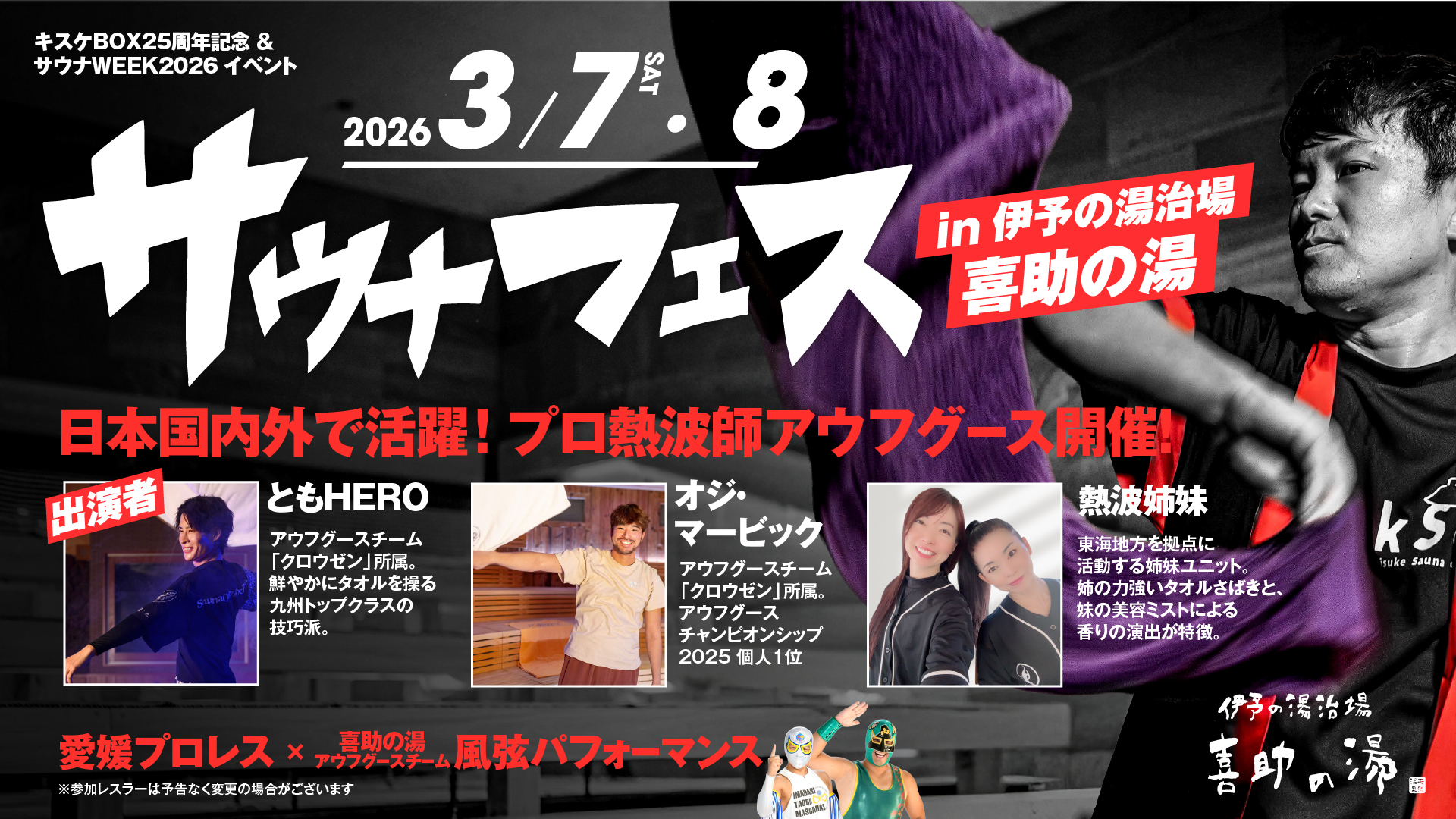 出演は、ACJ個人部門優勝の「オジ・マービック」、クロウゼン所属の「ともHERO」、姉妹ユニット「熱波姉妹」(2026年3月8日(日)のみ特別出演)、開催地・喜助の湯のキスケ熱波師チーム「風弦」、さらにkSc公式アンバサダー「愛媛プロレス」(2026年3月7日(土)のみ特別出演、出演レスラーは後日発表)を予定しています。熱波師それぞれの個性と演出が交差し、時間帯ごとにサウナ室の表情が変わる2日間になります。
